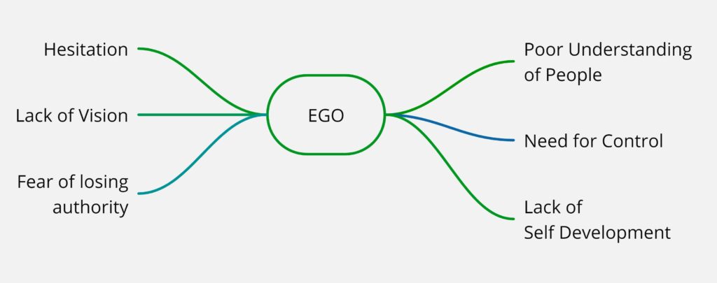 In the realm of leadership, the ego can be both an invisible barrier and a glaring obstacle. As shown in the accompanying mind map, ego manifests in various detrimental ways, including hesitation, lack of vision, fear of losing authority, poor understanding of people, need for control, and lack of self-development.